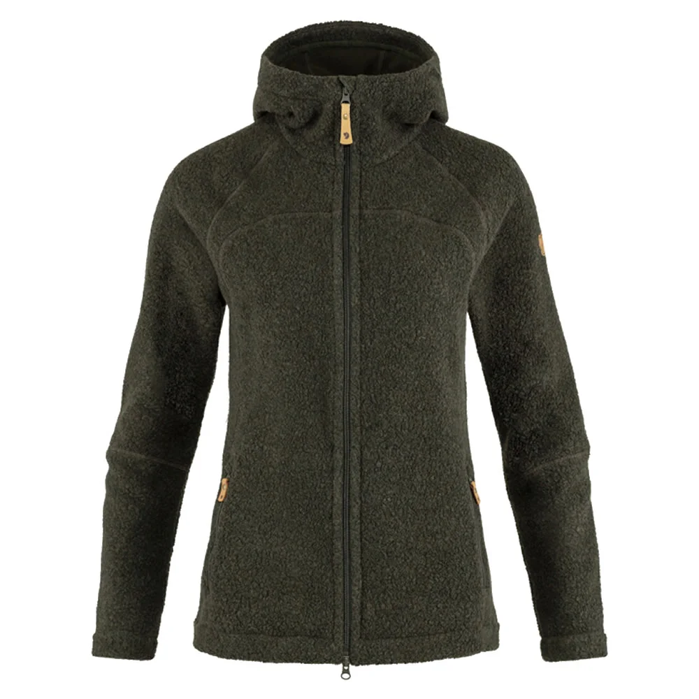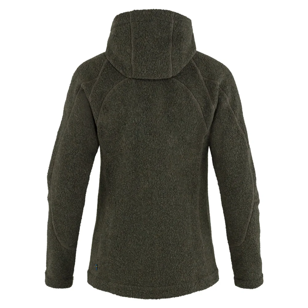 La chaqueta polar de la marca FJALL RAVEN es cómoda con capucha ajustada y textura ondulada. Esta confeccionada con una mezcla funcional de lana que combina las propiedades termorreguladoras de la lana con la durabilidad del poliéster. Perfecta como capa intermedia que retiene el calor, ideal para relajarse cómodamente después de una caminata.