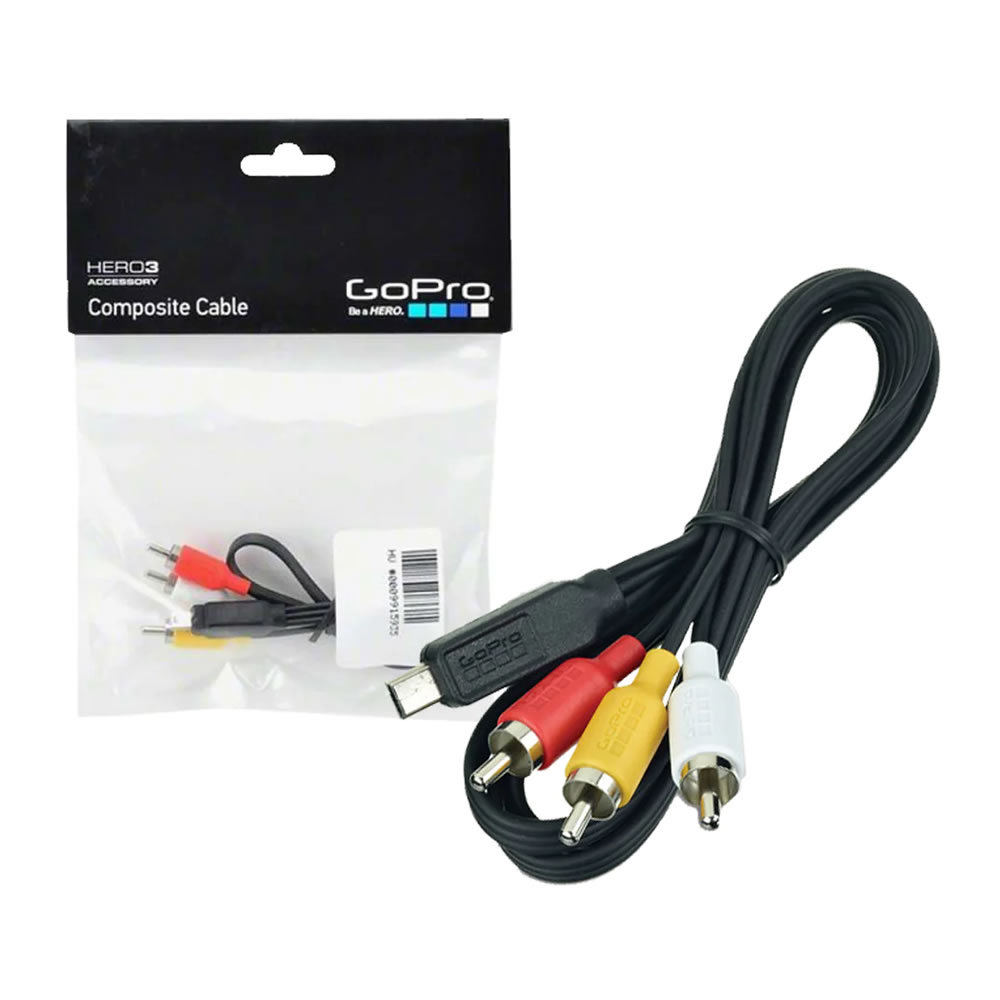 El cable compuesto GoPro diseñado para HERO3 / HERO3+ / HERO4 establece una conexión eficiente desde el puerto mini-USB de su cámara hacia su televisor mediante salida de video compuesto y salida de audio estéreo (RCA) izquierda/derecha. Facilita la vista previa y reproducción en definición estándar de sus videos y fotos GoPro.